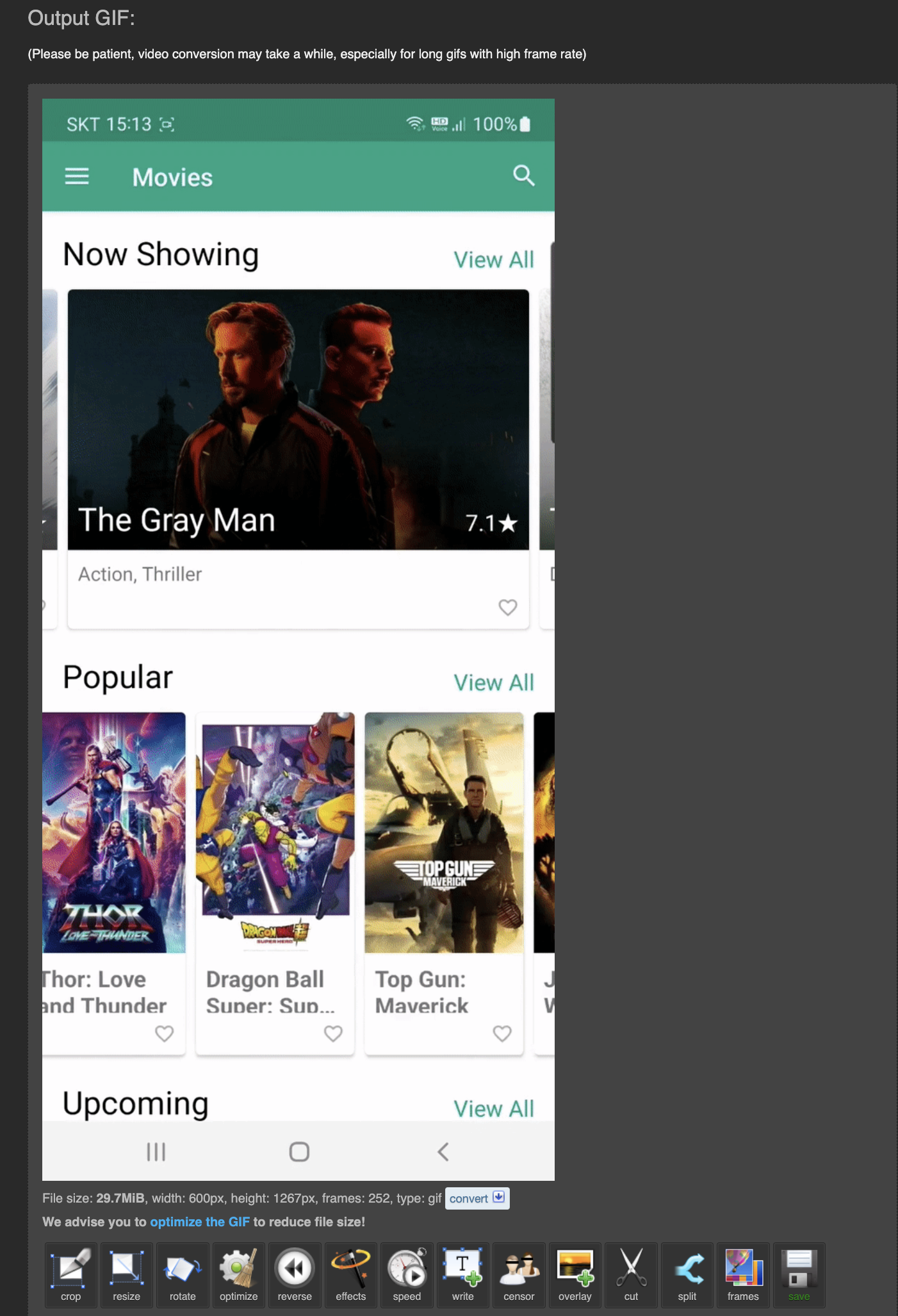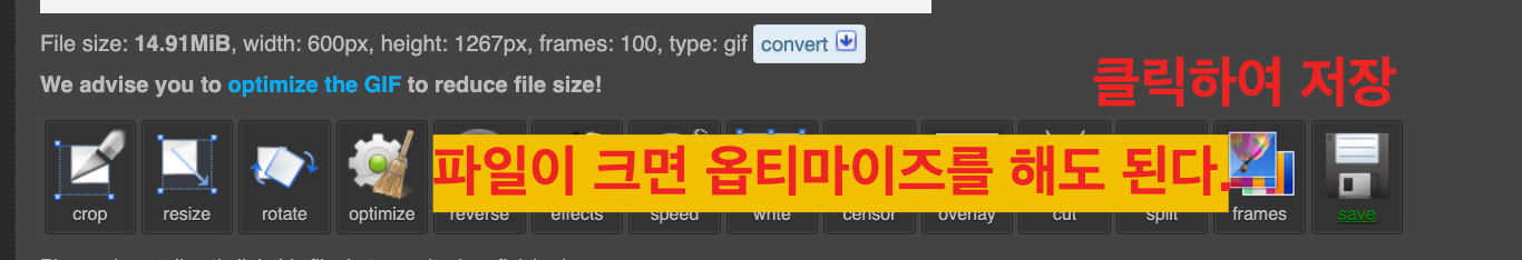 FileSize가 크다면 Optimze버튼을 누르던지 아니면 위에서 동영상 재생시간을 줄이던지, 아니면 Frame을 낮춰서 다시 변환해보면 된다.
