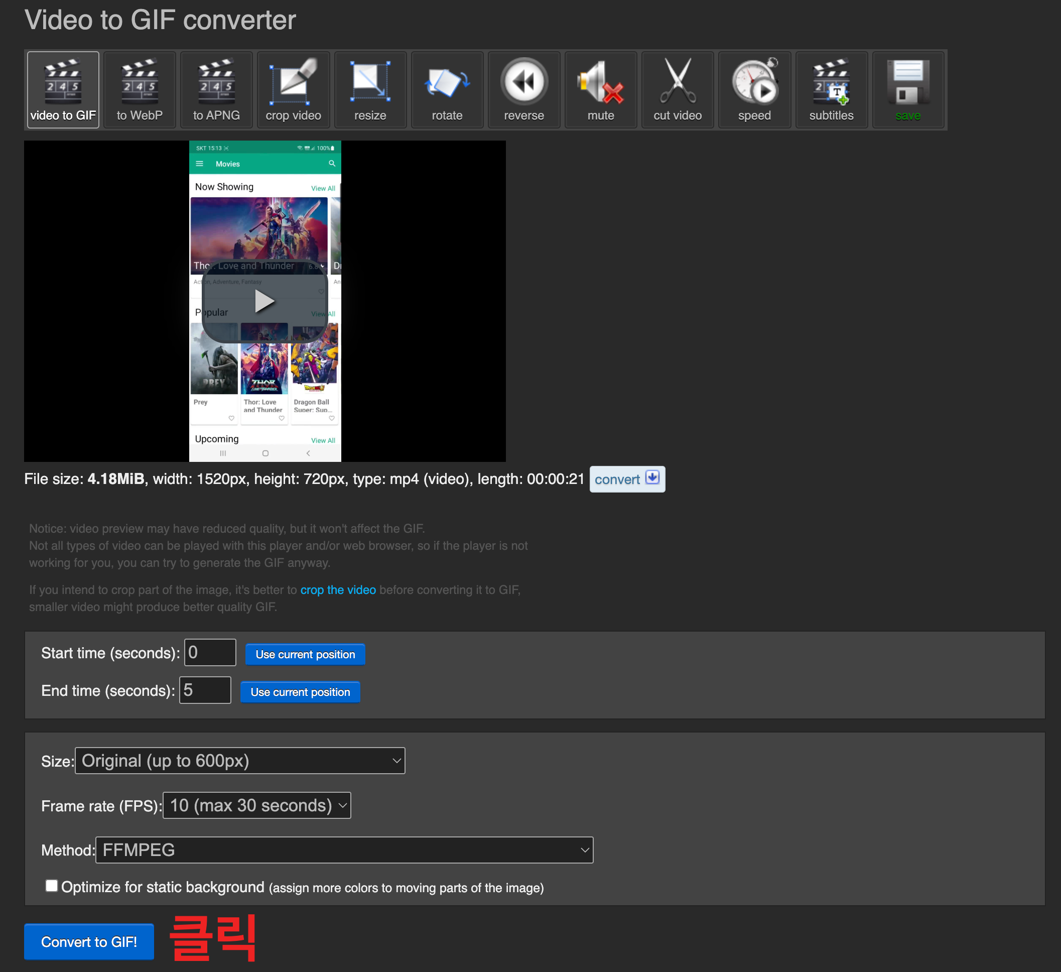 파일 업로드가 끝나면 아래처럼 동영상을 보여준다. 하단의 "Convert to GIF!" 버튼을 누른다.