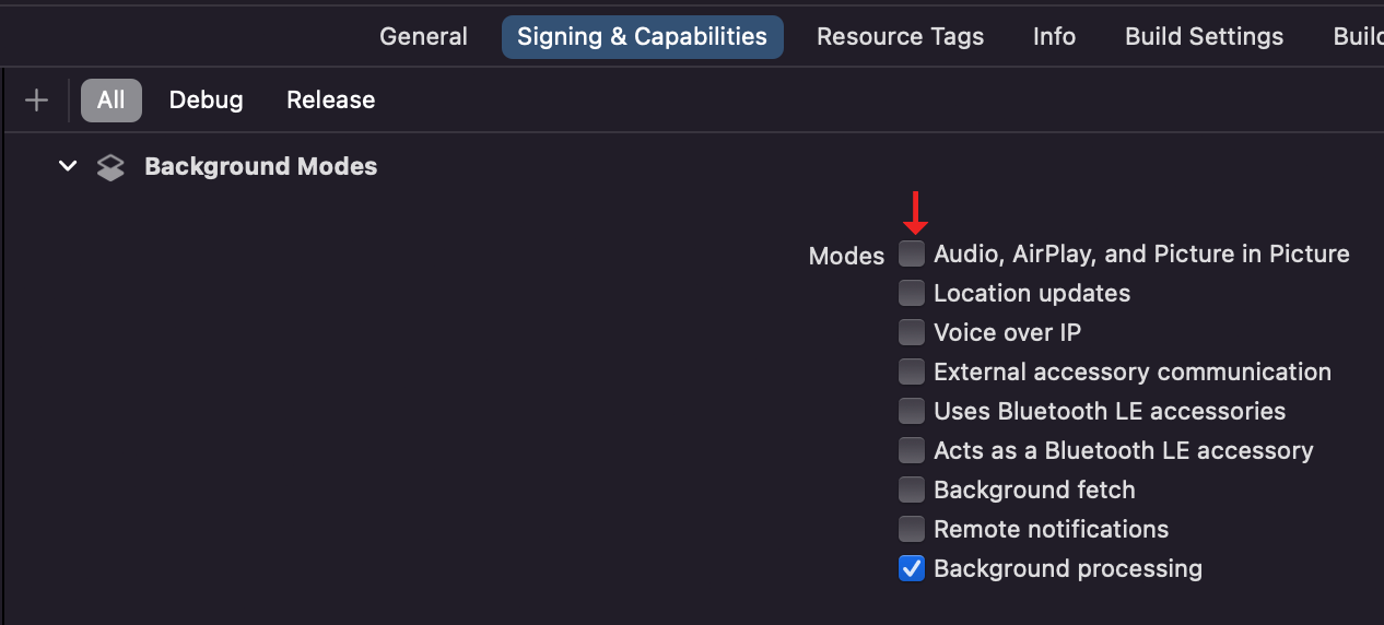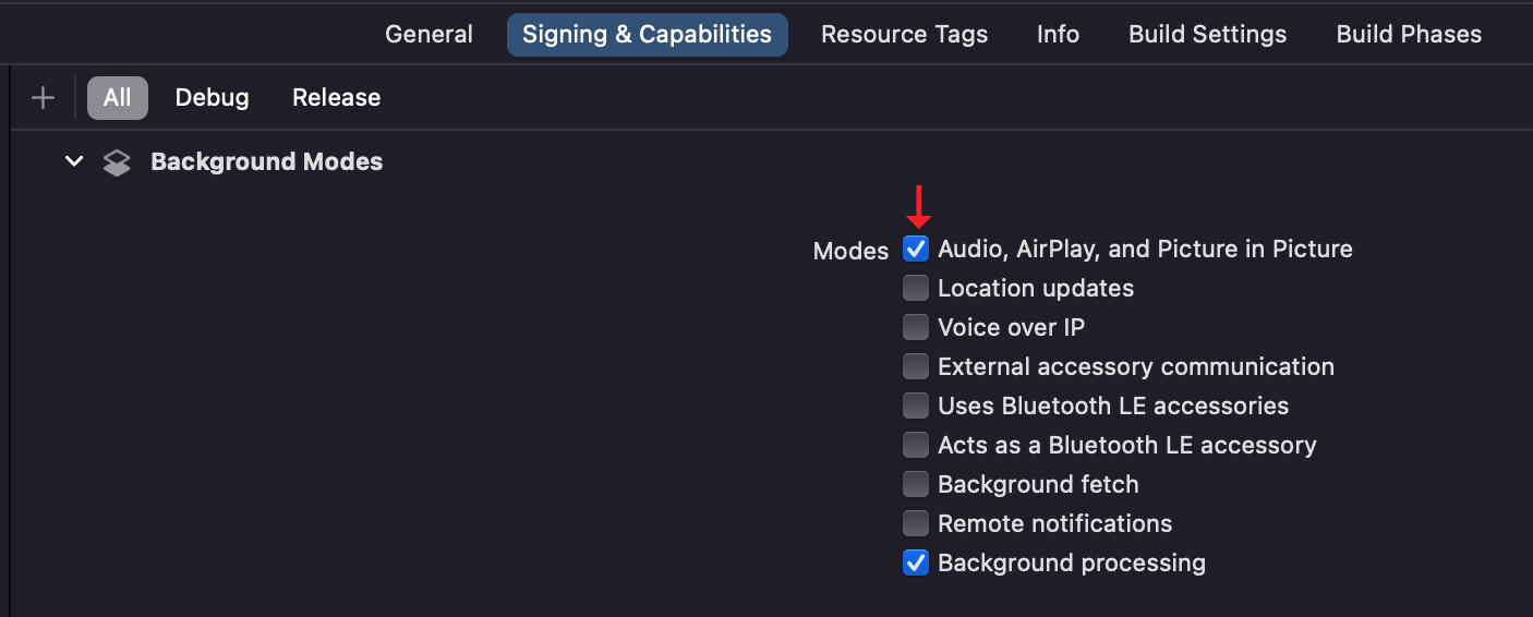 Signing & Capbilities에서 보면 Audio 및 AirPlay와 Picture in Picture가 같이 묶여 있는걸 볼수 있다.