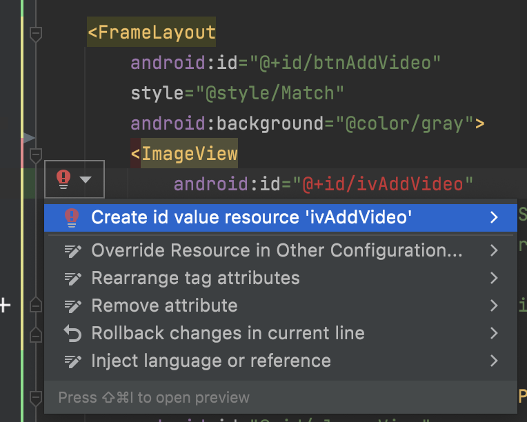 갑자기 아래처럼 id에 빨간색이 나온다. 이럴 때는 당황하지 말고 안드로이드 스튜디오를 껏다 켜자.