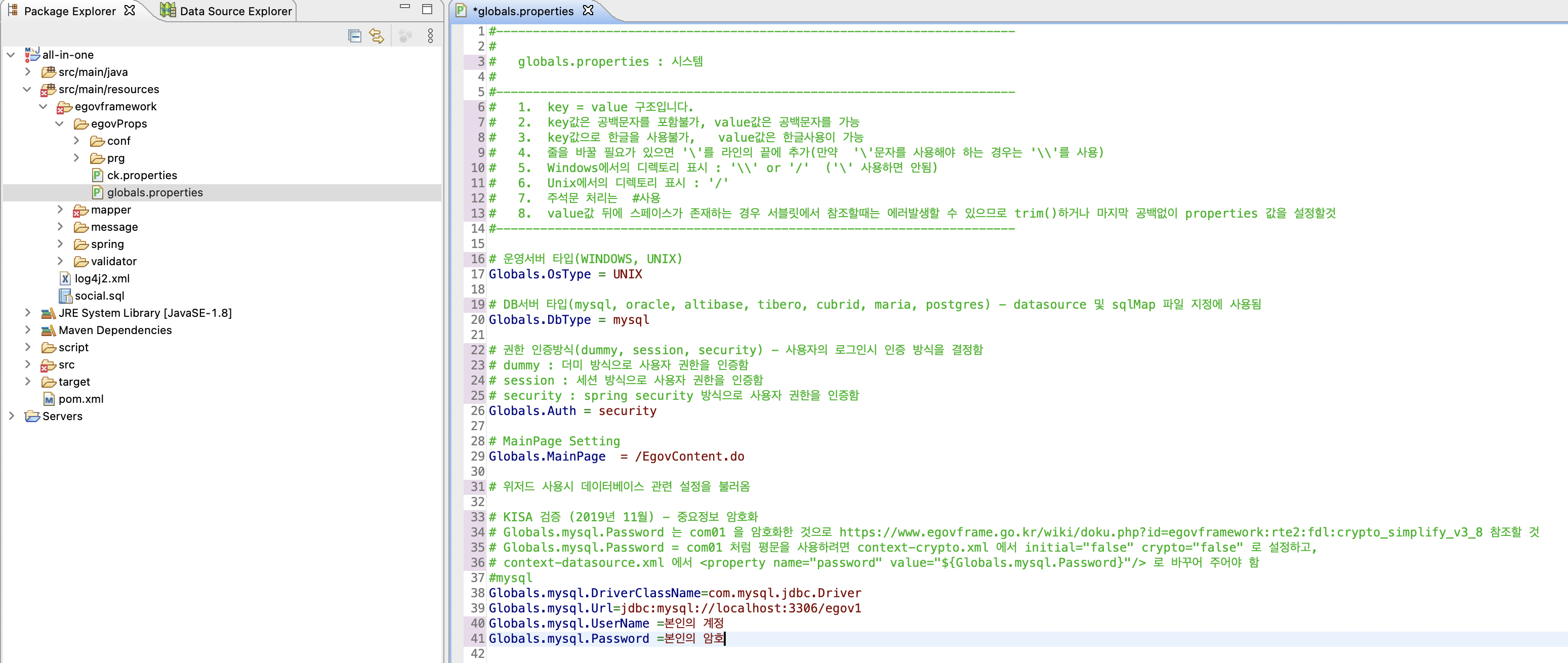 # context-datasource.xml 에서 <property name="password" value="${Globals.mysql.Password}"/> 로 바꾸어 주어야 함