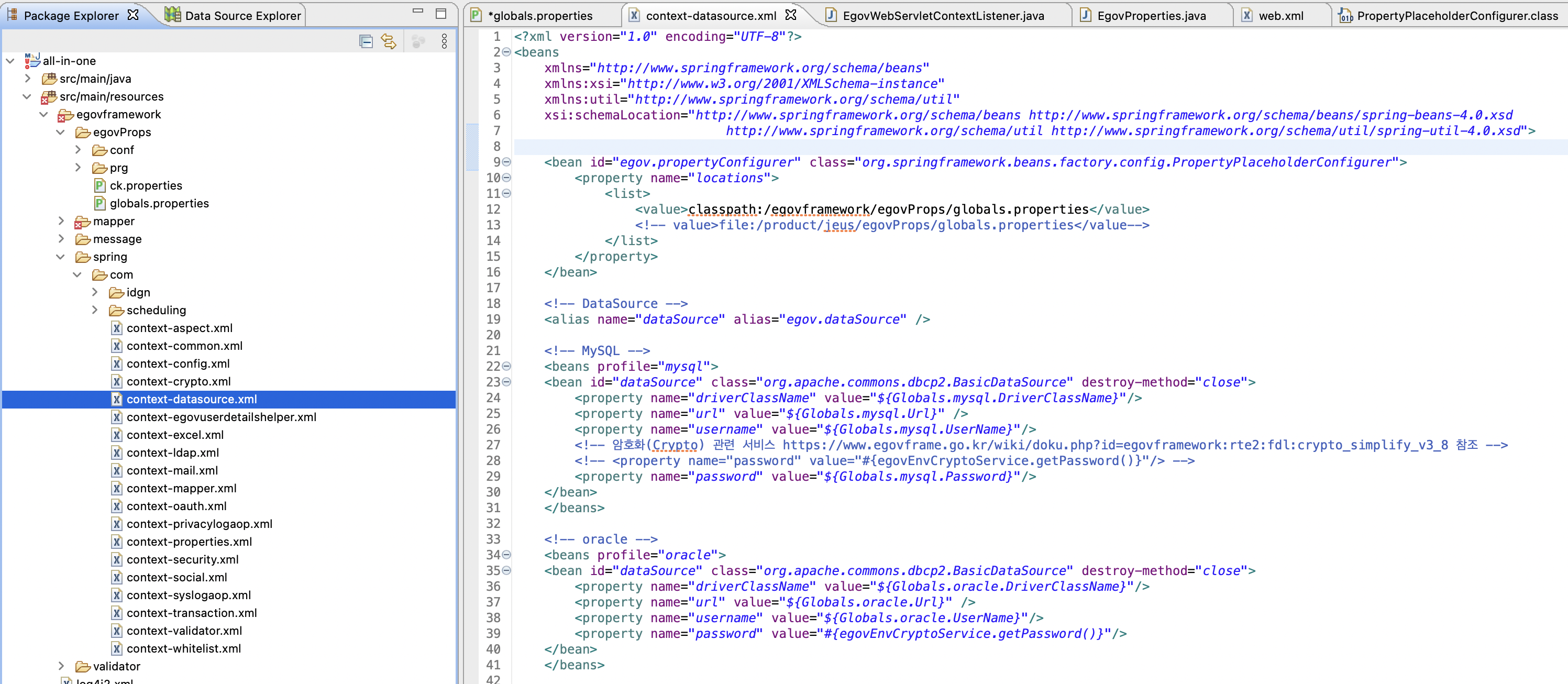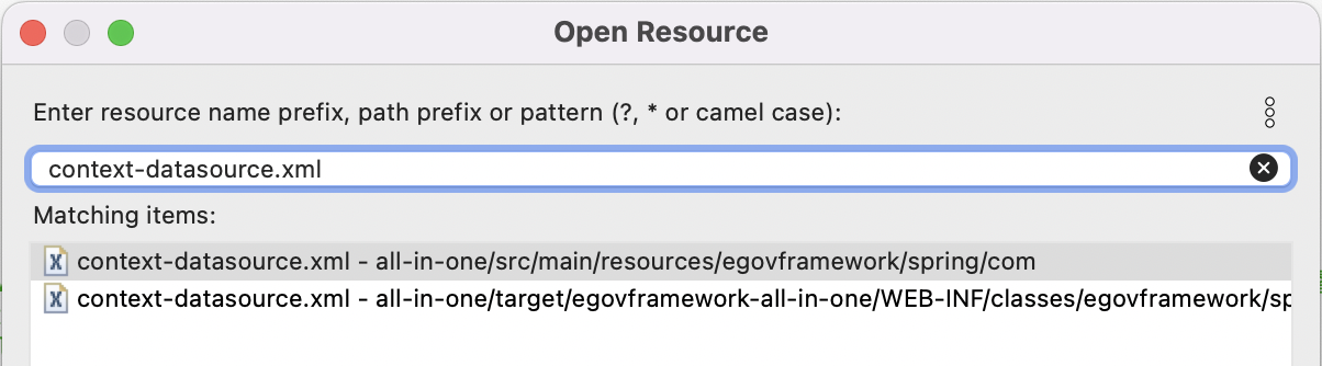 그럼 Globals.DbType 기준으로 context-datasource.xml 파일에 설정되어 있는 Spring Pofile기능에 의하여 dataSource 빈이 활성화 된다.라고 적혀 있다. context-datasource.xml을 보자. (파일명으로 찾기 단축키 Shift + Command + R)