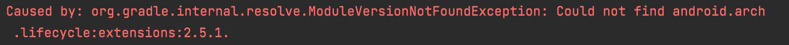 원래는 Could not find android.arch.lifecycle:extensions:2.0.0.여서 혹시나 하는 마음에 최신인 2.5.1로 올렸지만 여전히 같은 에러가 난다.