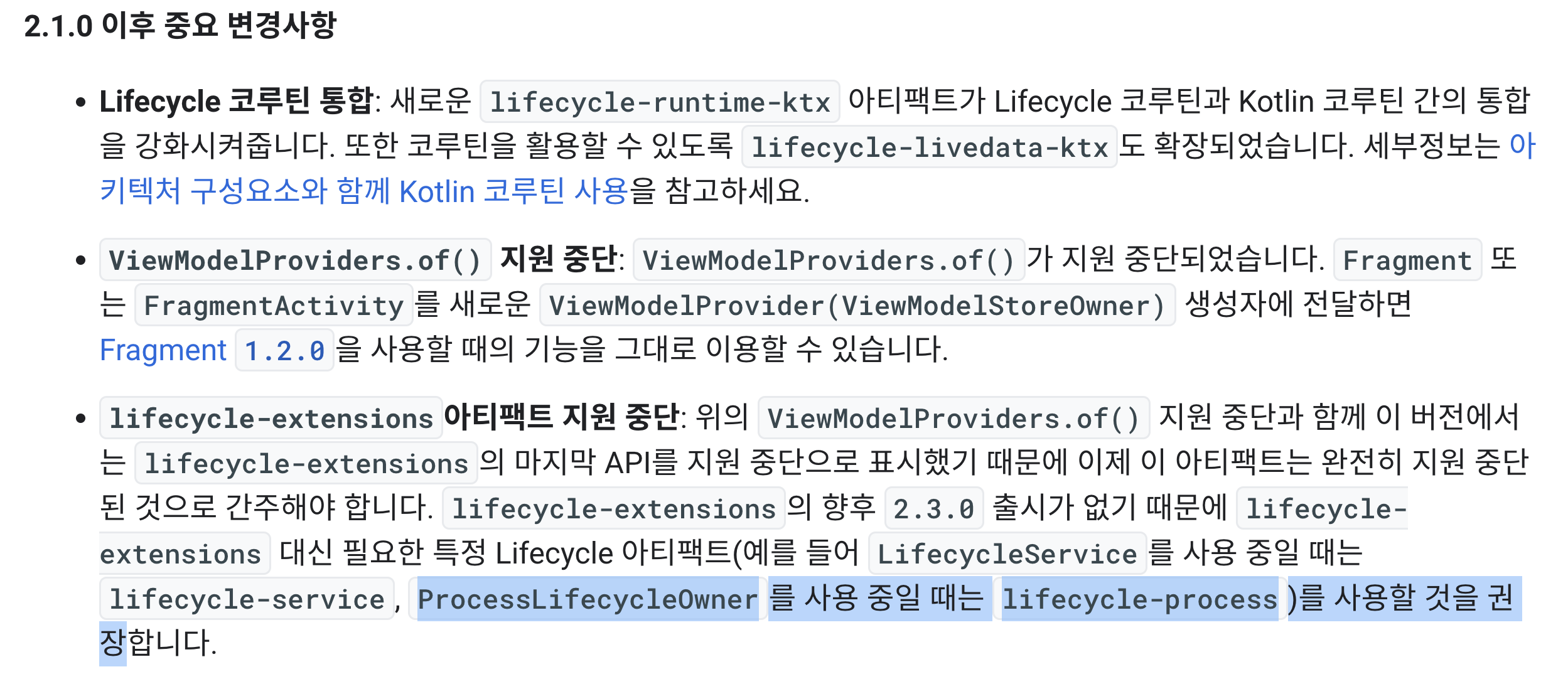 lifecycle-extensions의 향후 2.3.0 출시가 없기 때문에 lifecycle-extensions 대신 필요한 특정 Lifecycle 아티팩트(예를 들어 LifecycleService를 사용 중일 때는 lifecycle-service, ProcessLifecycleOwner를 사용 중일 때는 lifecycle-process)를 사용할 것을 권장합니다.