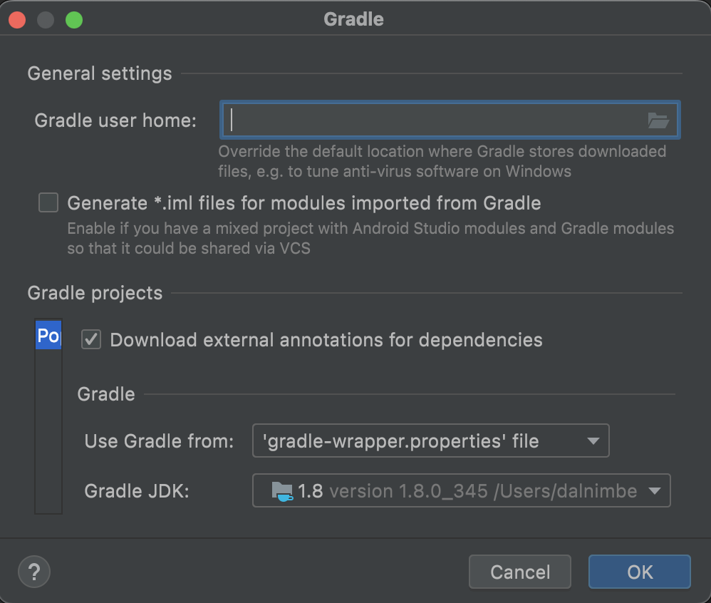 파란색으로 된 Gradle settings를 클릭해보니 아래 화면이 뜬다. 현재 JDK는 1.8이다.