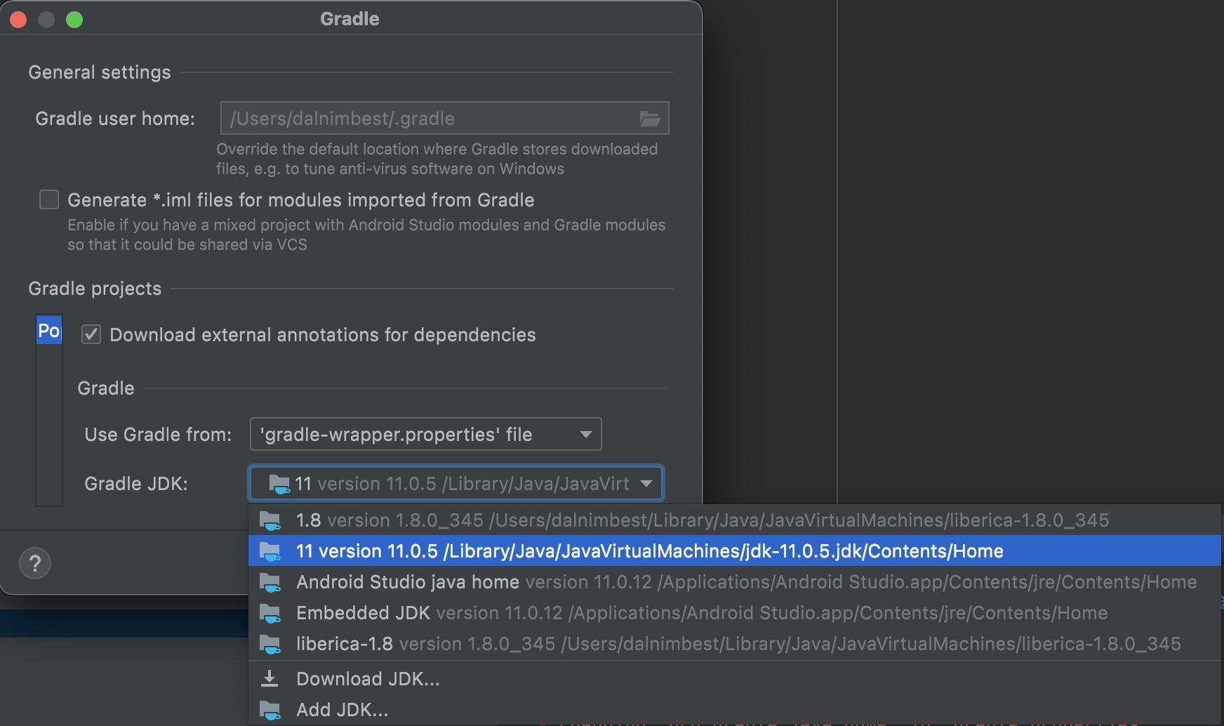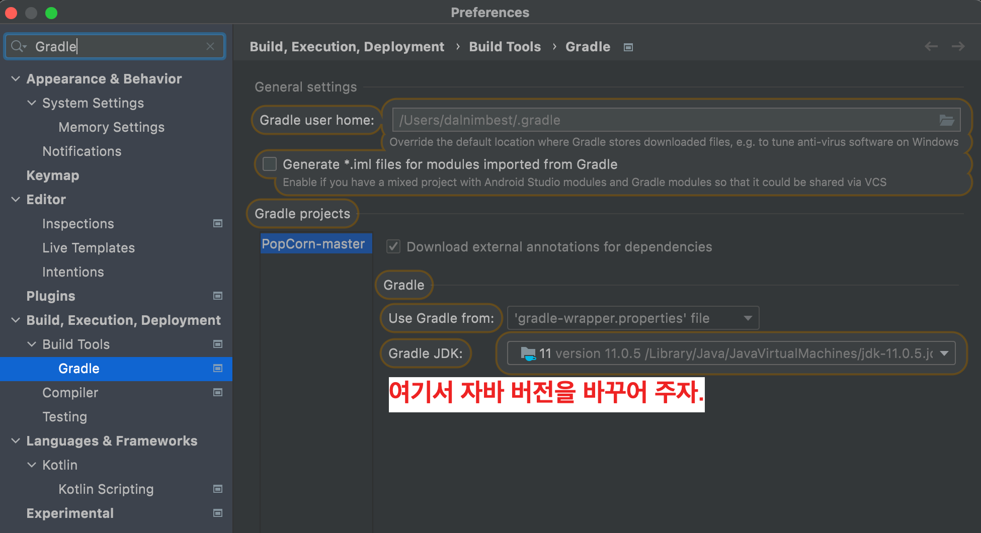 - changing `org.gradle.java.home` in `gradle.properties`. (gradle.properties파일에서 org.gradle.java.home 변경, 이건 못찾겠다.)