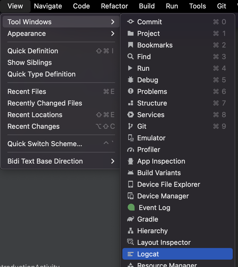 또는 하단의 로그캣 탭바를 선택해도 된다.