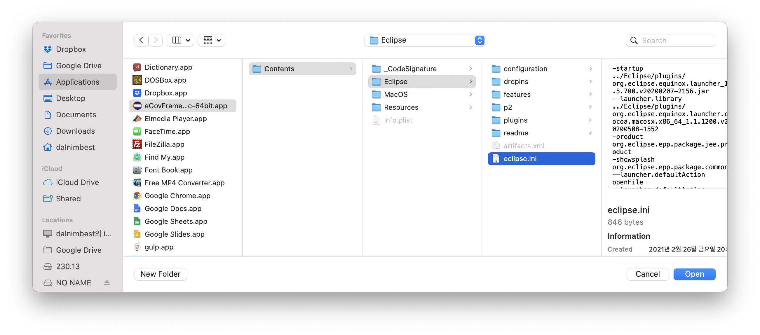 이클립스가 설치된 경로에서 ini파일을 선택해야 한다.