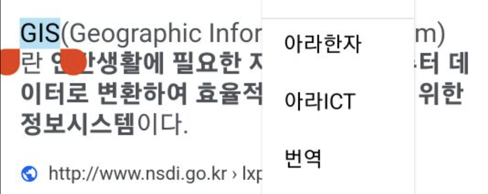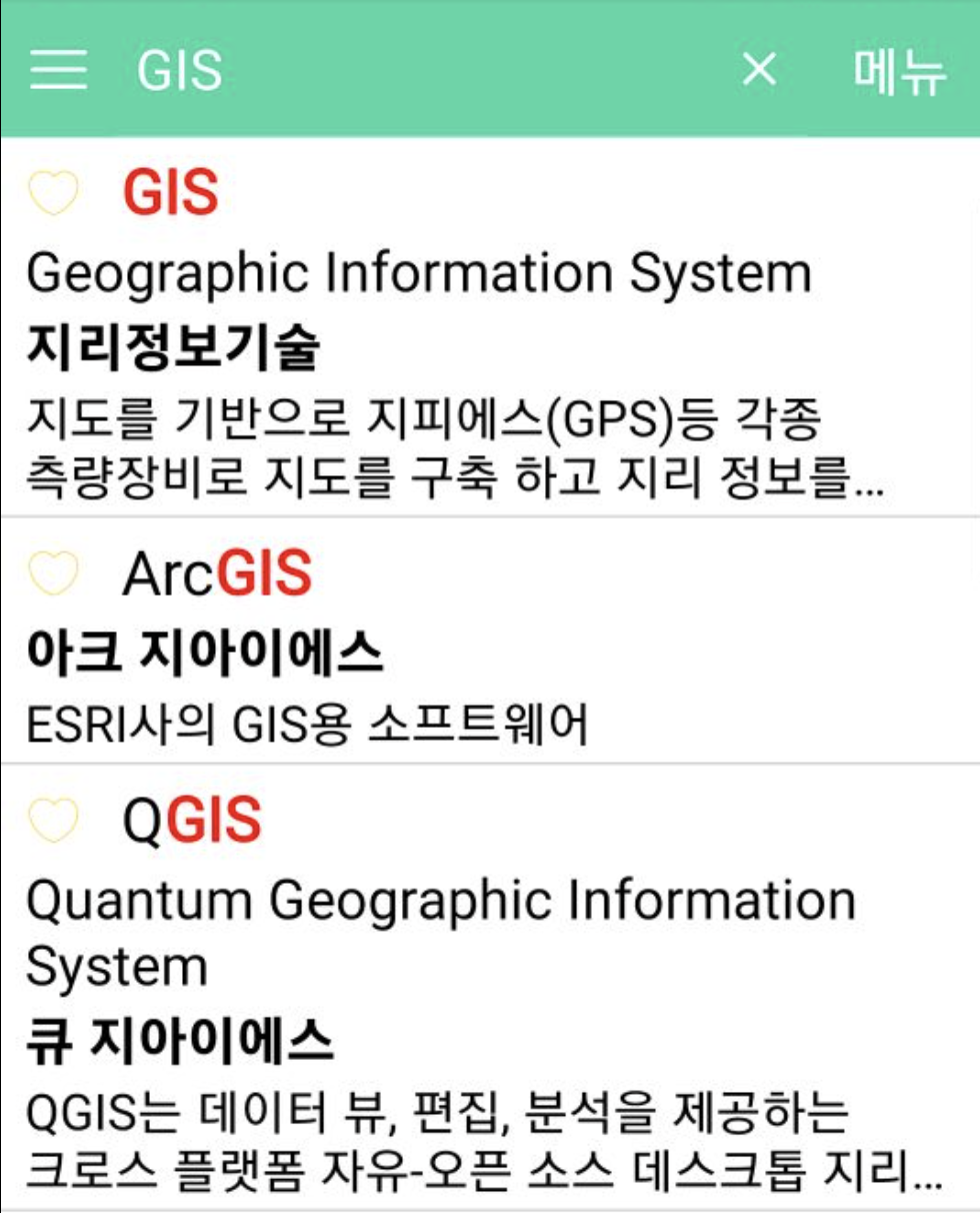 아라ICT앱을 열고 선택한 문구"GIS"가 포함된 용어 리스트를 보여줌.