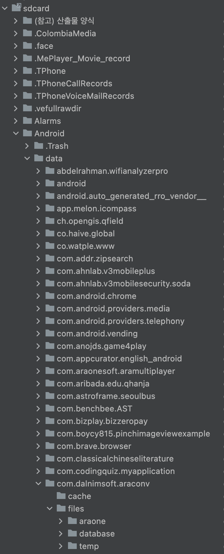 /sdcard/Android/data/com.dalnimsoft.araconv/cache는 외부 저장공간이라고 한다.