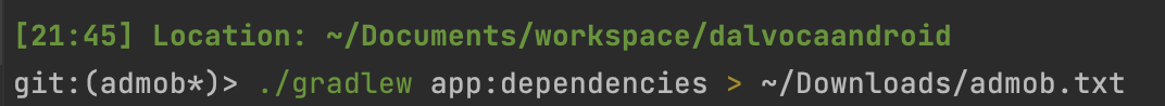 출력이 너무 길어서 ./gradlew app:dependencies > ~/Downloads/admob.txt 로 결과물을 txt파일로 저장했다.
