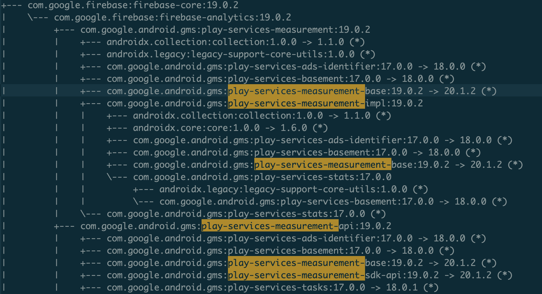 챗GPT에 물어보니 중복된 라이브러리(com.google.android.gms:play-services-measurement-base and com.google.android.gms:play-services-measurement-impl)가 있는 dependency를 찾아라고 한다.
