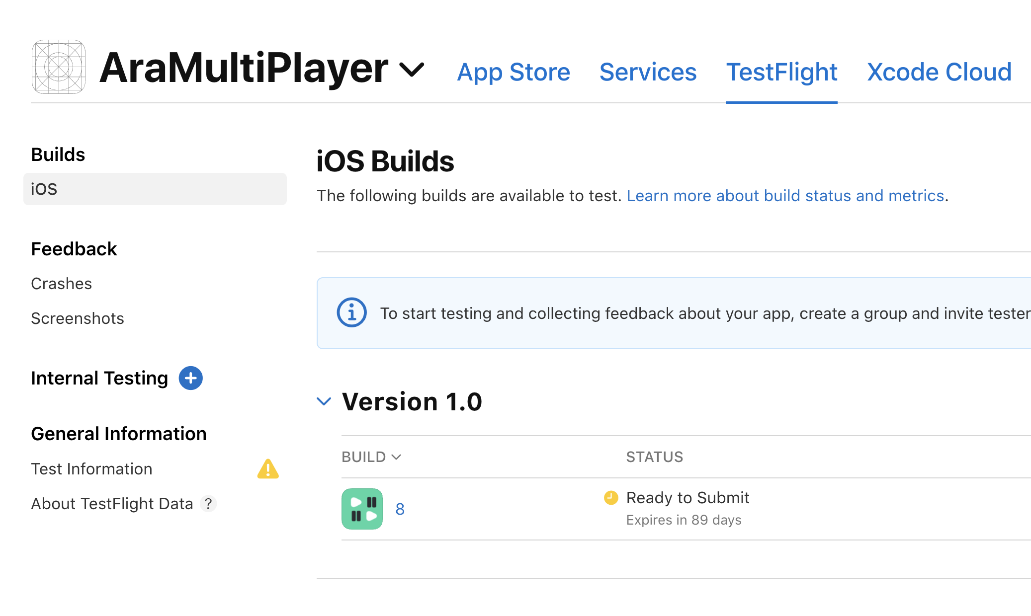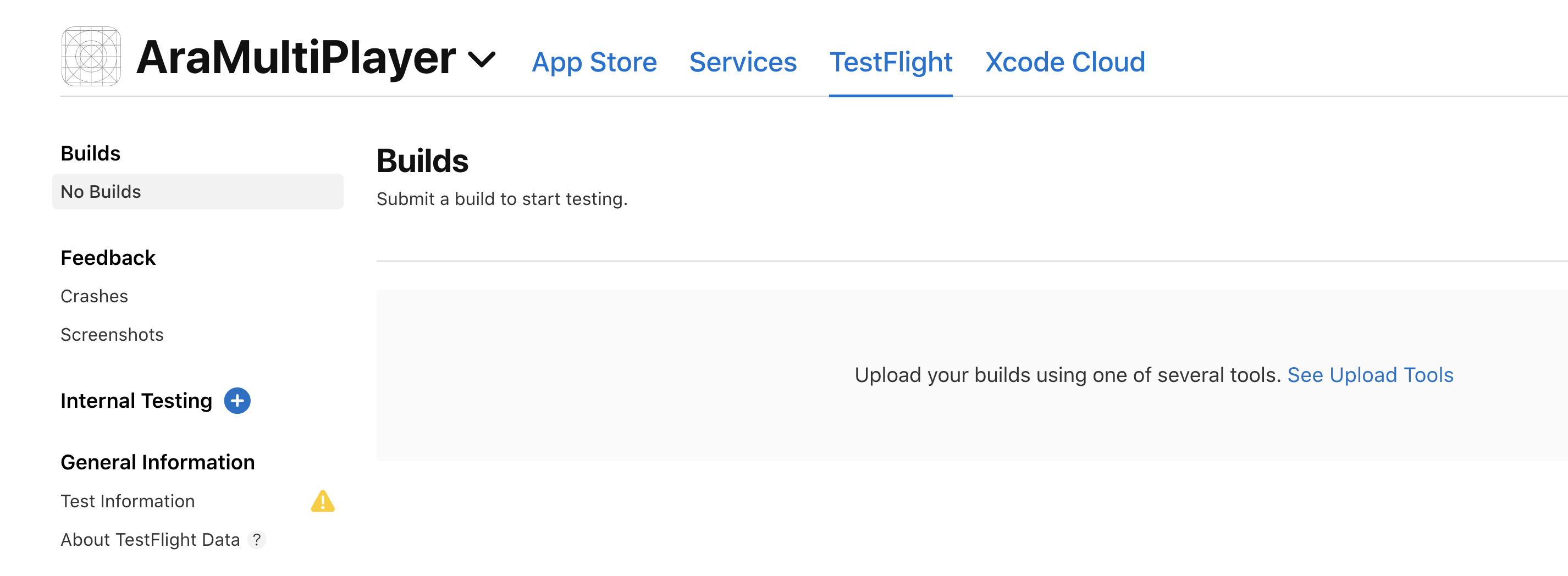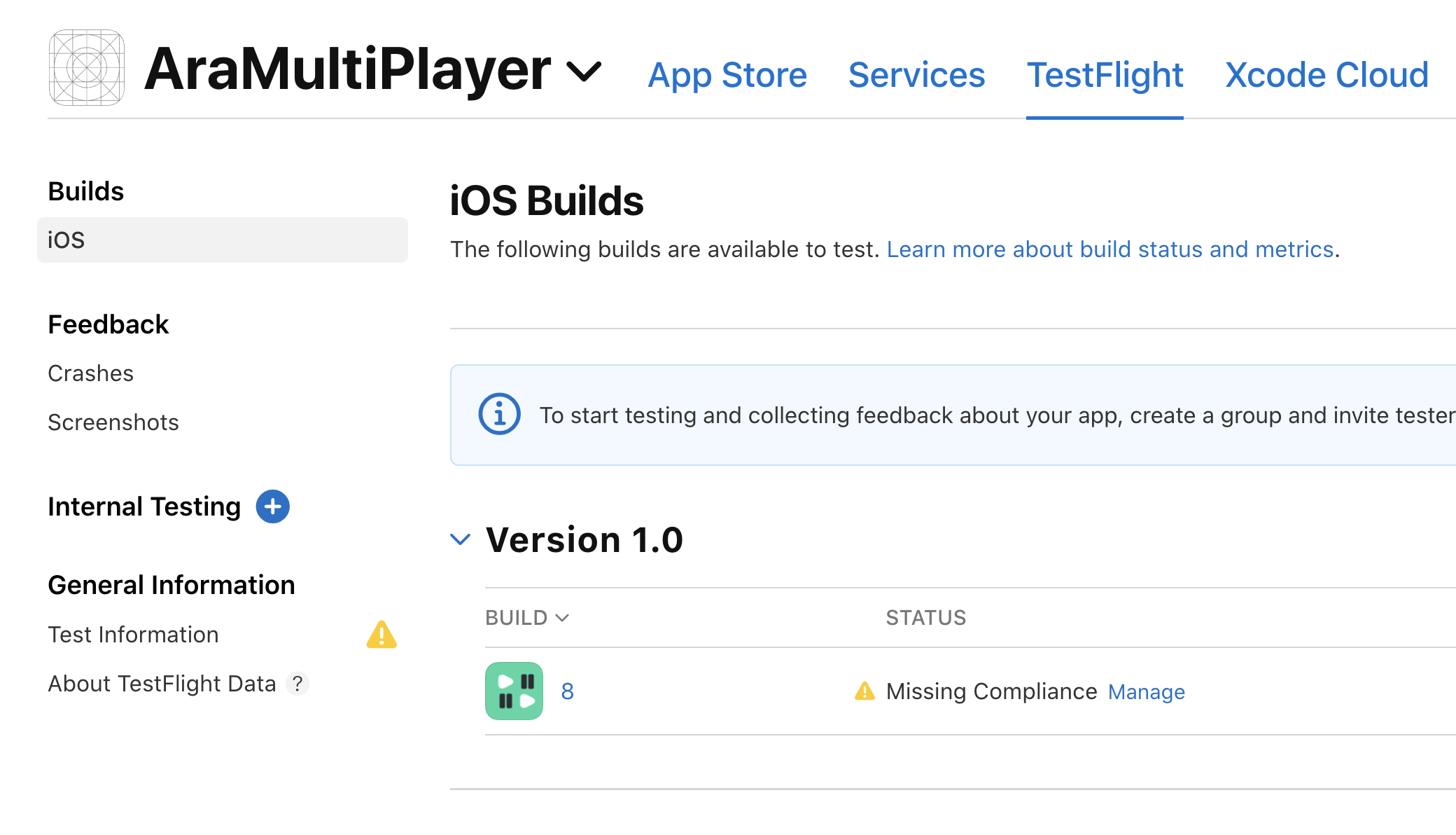 TestFlight가보니 Builds에 보여야 하는데, 안보인다. (테스트를 할필요가 없어도, 앱을 올리면 여기로 올라온다.)