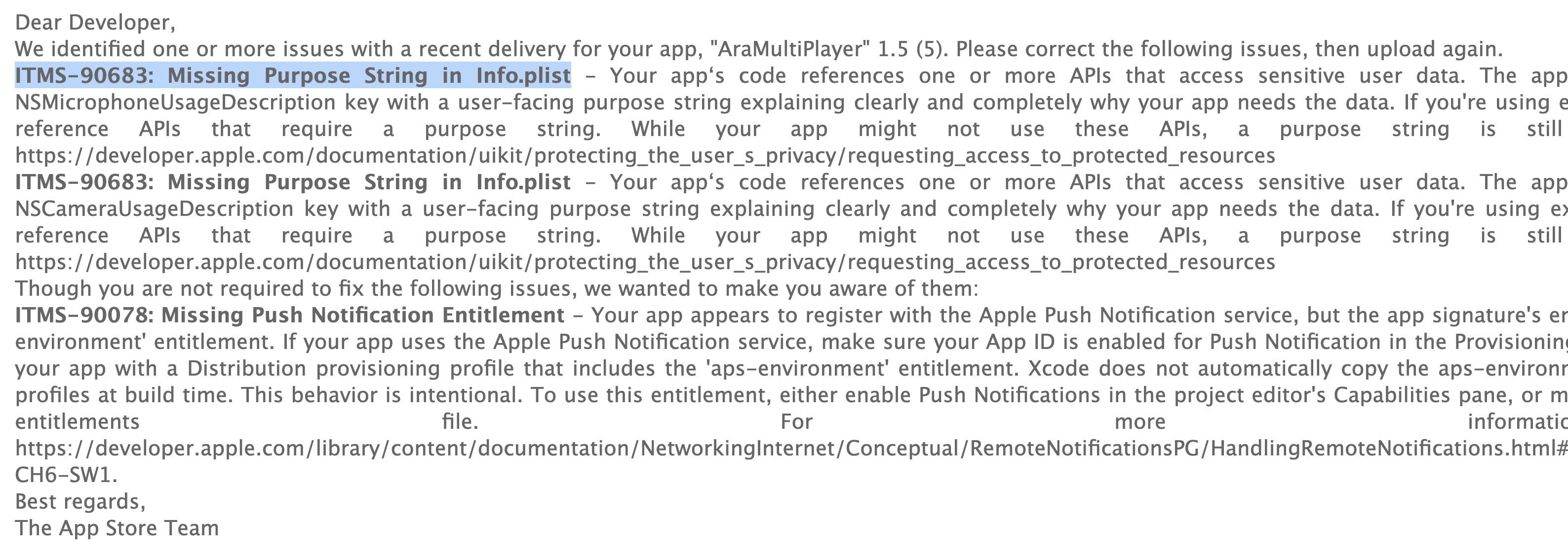 프로세싱 결과로 "App Store Connect: Your app AraMultiPlayer has one or more issues" 라는 메일을 받았다.