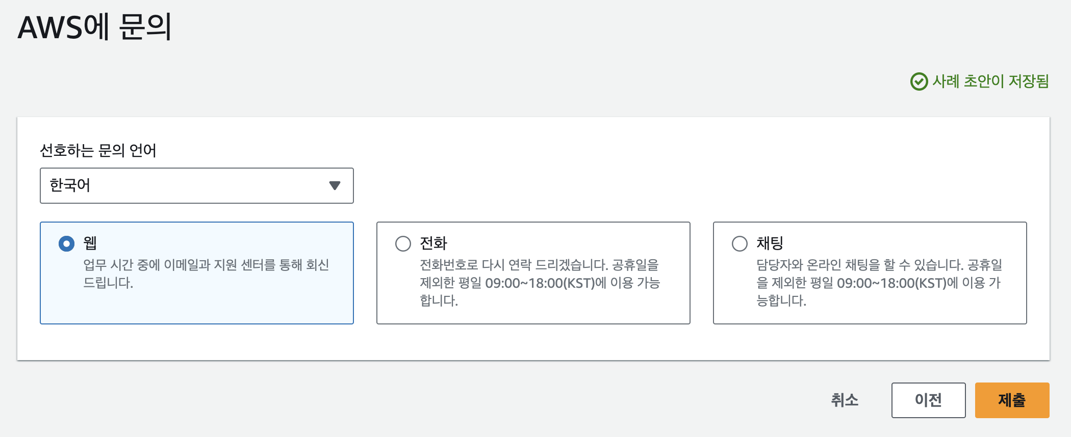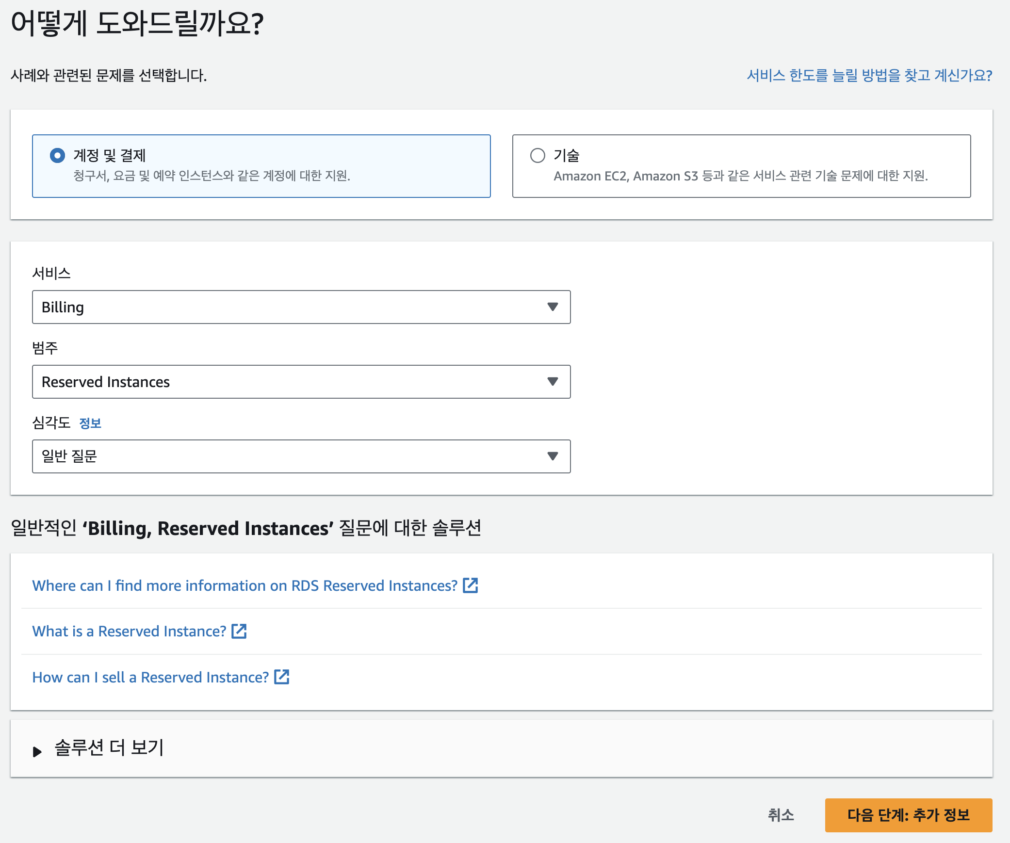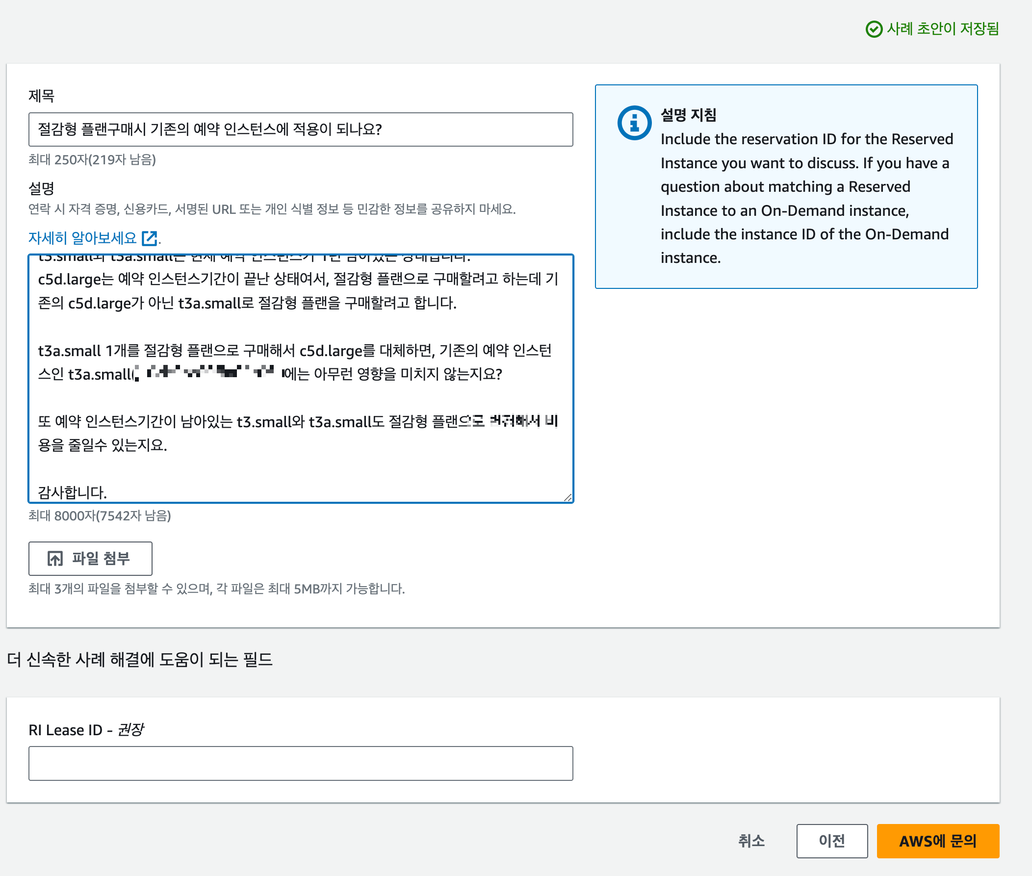 제목과 설명을 적는데 아래의 RI Lease ID는 뭔지 몰라서 비워놓고 "AWS에 문의" 버튼을 클릭하니 RI Lease ID가 필요하다고 하면서 안넘어 갔다. 화면 캡쳐는 못했는데 "RI Lease ID" 하단에 무슨 체크박스가 나오는데 그걸 클릭하니 다음으로 넘어가진다.