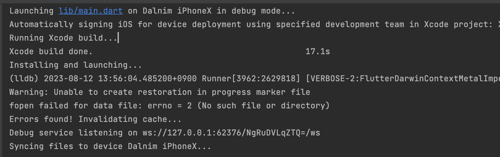 XCode에 있는 시물레이터에서는 잘 돌아가는 플러터앱이 iOS 실 기기에 실제로 돌려보니 아래처럼 에러가 난다.