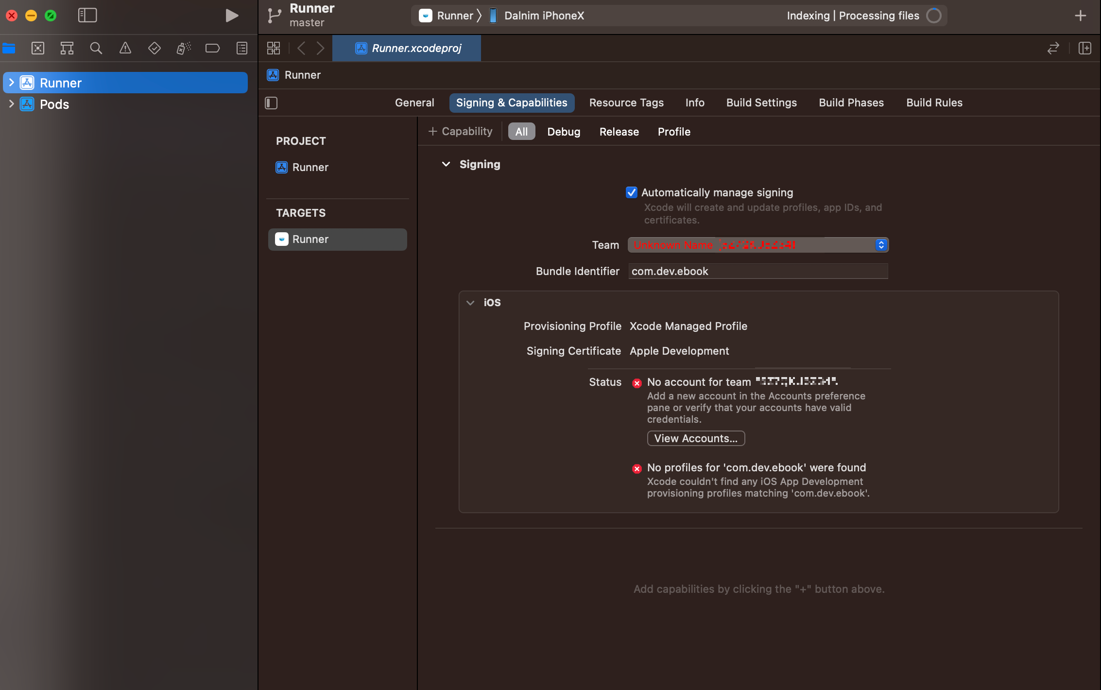 Error (Xcode): No profiles for 'com.dev.ebook' were found: Xcode couldn't find any iOS App Development provisioning profiles matching 'com.dev.ebook'. Automatic signing is disabled and unable to generate a profile. To enable automatic signing, pass -allowProvisioningUpdates to xcodebuild.