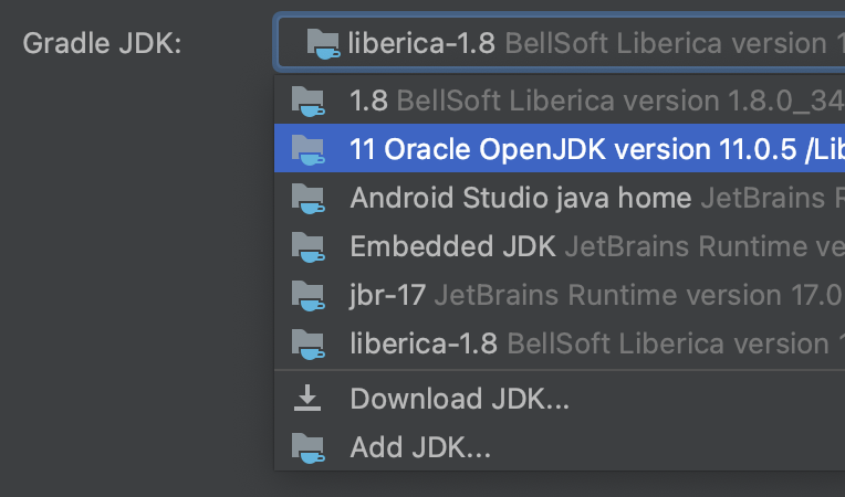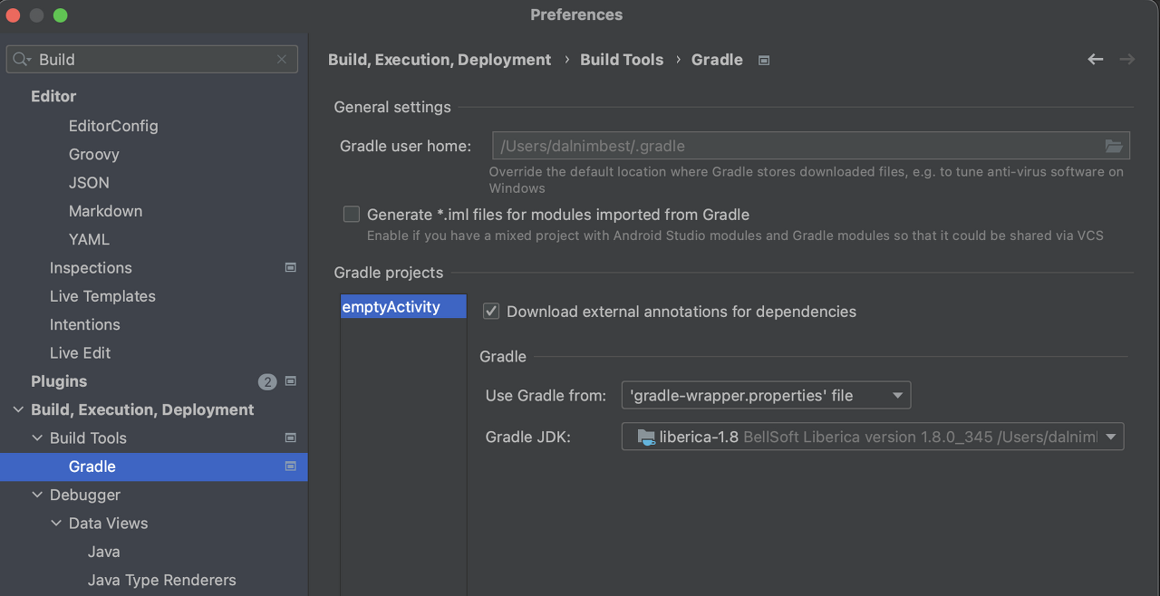Build Tools의 Gradle을 선택해서 보면, 내같은 경우에는 BellSoft에서 만든 liberica-1.8 JDK가 선택되어 있다.