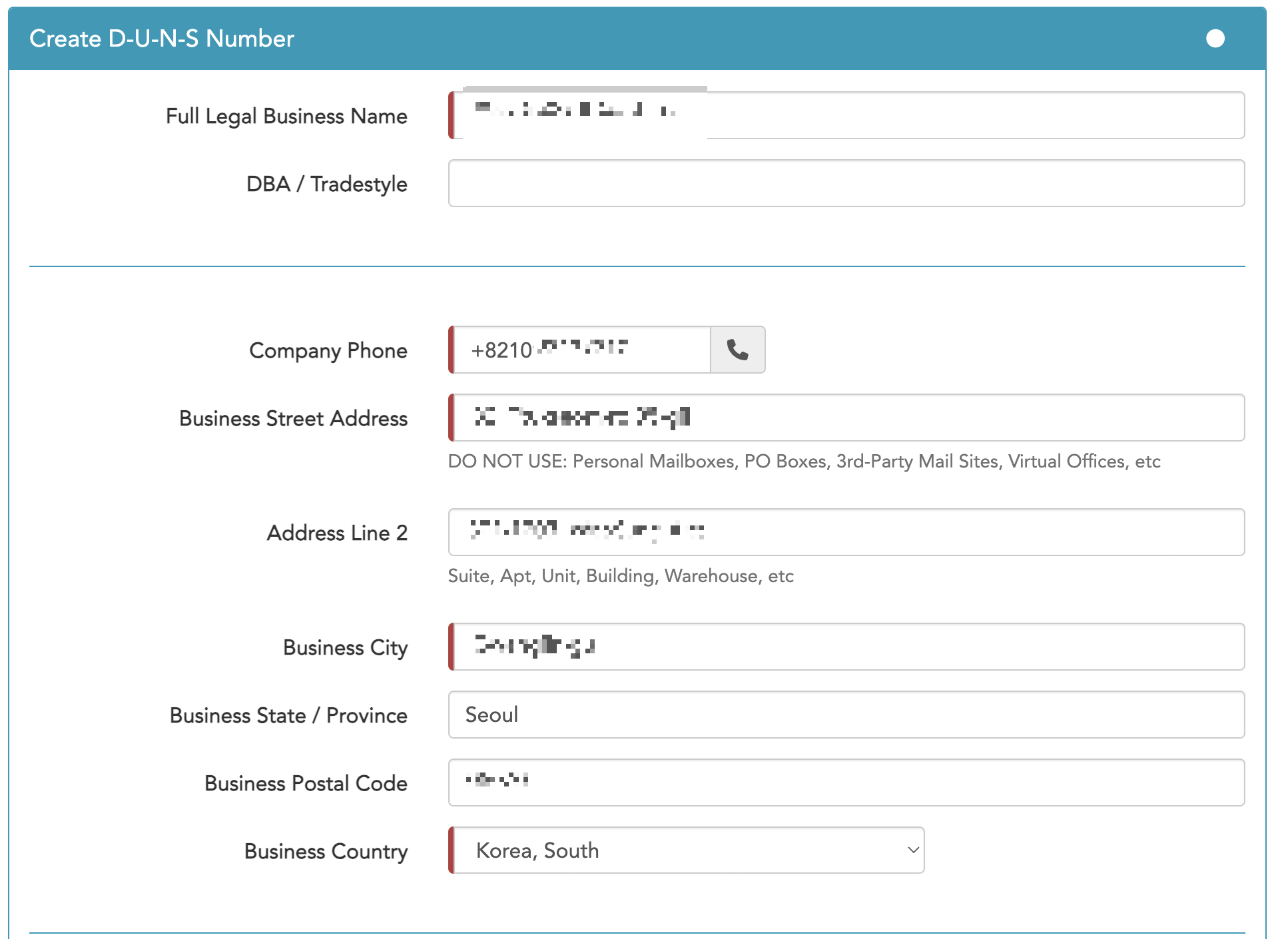 Contact Info를 가지고 있는 영문 사업자 등록증을 참고해서 스펠링 안틀리게 영문으로 잘 적어준다. 사업자 등록증의 내용을 복사해서 붙여 넣자. 서울같은 경우는 City와 State가 헷갈리는데 상관없는거 같다.