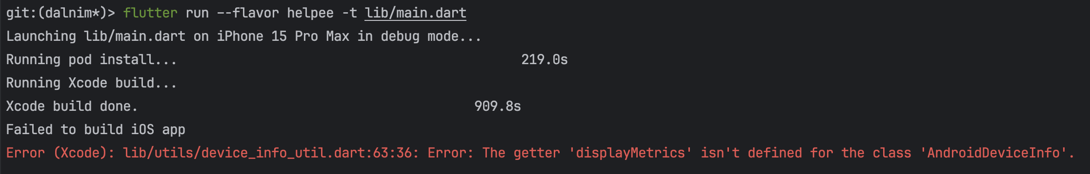 git:(dalnim*)> flutter run –-flavor helpee -t lib/main.dart
