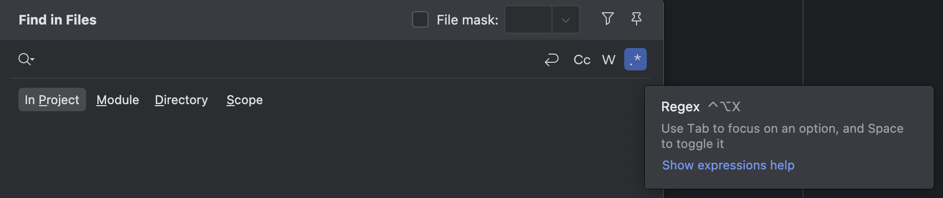 정규표현식을 사용할려면 Find in Files의 맨 오른쪽의 Regex버턴을 활성화 시킨다.