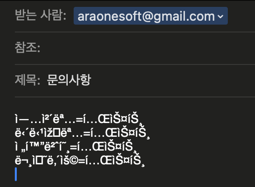 그런데 "메일 보내기"를 클릭하면 메일 앱이 뜨는데(나는 맥 사용중이다), 제목은 정상적으로 들어오는데 input으로 받은 텍스트가 깨져보인다.