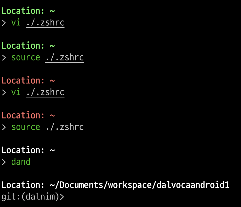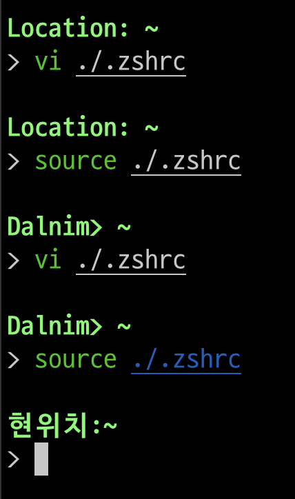 수정한후에는 source ./.zshrc를 실행해주면 된다. (source대신 .을 사용해도 되나, 가끔 .이 잘 안먹을때가 있다. 그래서 난 항상 source명령어를 그대로 사용한다.)