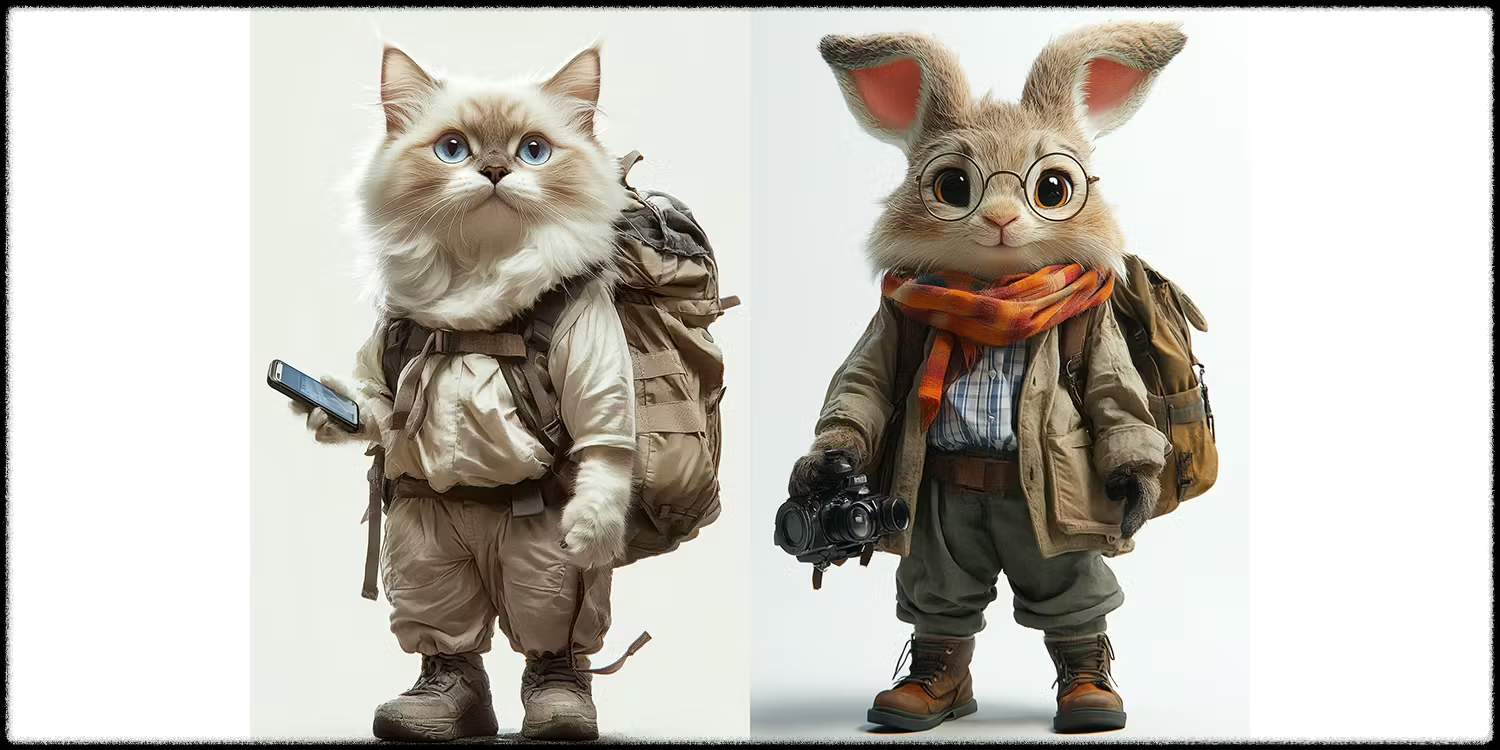 번역하면 대충 "에펠탑 입구를 향해 걸어가는 의인화된 푹신푹신한 크림색 고양이와 갈색 토끼의 초현실적인 사진. 고양이는 스마트폰을 들고 그것을 보고 있으며, 안경과 스카프를 한 토끼는 흥분해서 앞을 가리키고 있습니다. 에펠탑은 배경에 부분적으로 보입니다. 둘 다 여행용 장비와 배낭을 메고 있습니다. 장면은 화창한 날에 촬영되었으며, 살짝 측면 각도에서 와이드 시네마틱 방식으로 담겨 있습니다." 이런 씩이다.