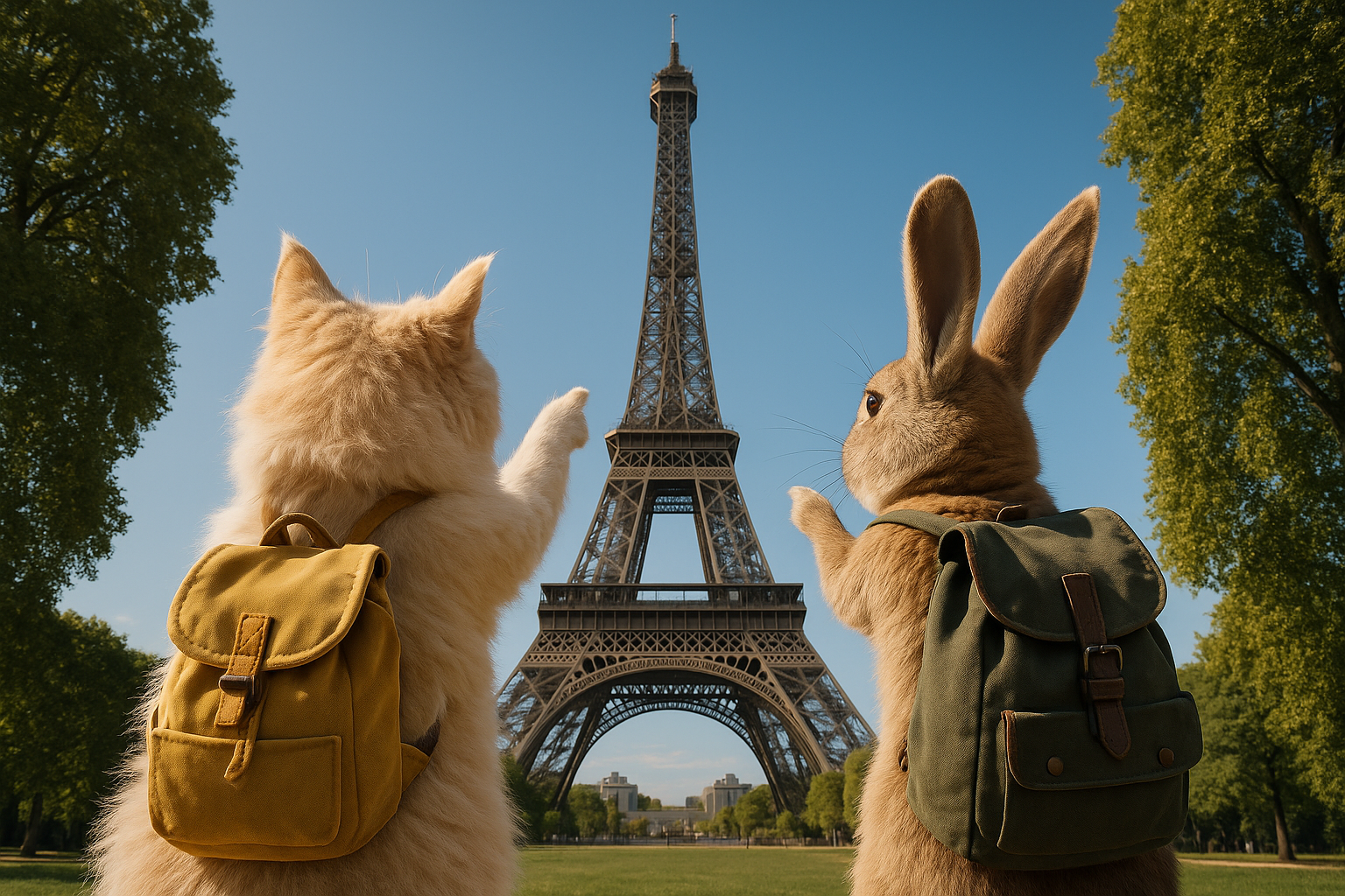 A hyper-realistic photo of the Eiffel Tower with an anthropomorphic fluffy cream-colored cat and a brown bunny standing in the foreground. The animals are facing the tower with their backs to the camera, pointing at it in amazement. They are wearing travel gear and backpacks. The cat and bunny are sized proportionally to the large trees on either side of the frame, making them quite large but still much smaller than the Eiffel Tower itself. The scene is captured on a sunny day with crisp, clear details and cinematic wide-angle framing.