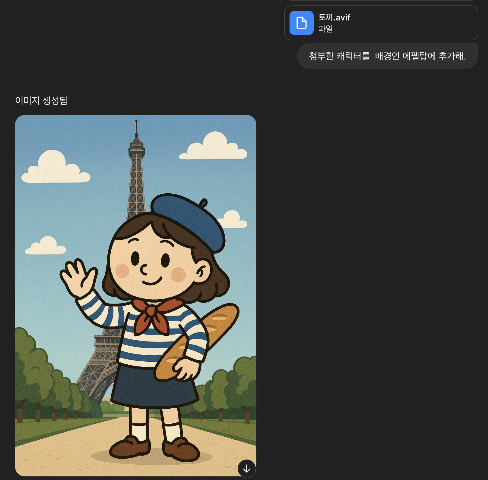 위 두개의 이미지를 챗지피티에 주면서 그냥 "첨부한 캐릭터를 배경인 에펠탑에 추가해."라고 하니 아래처럼 결과가 나온다.