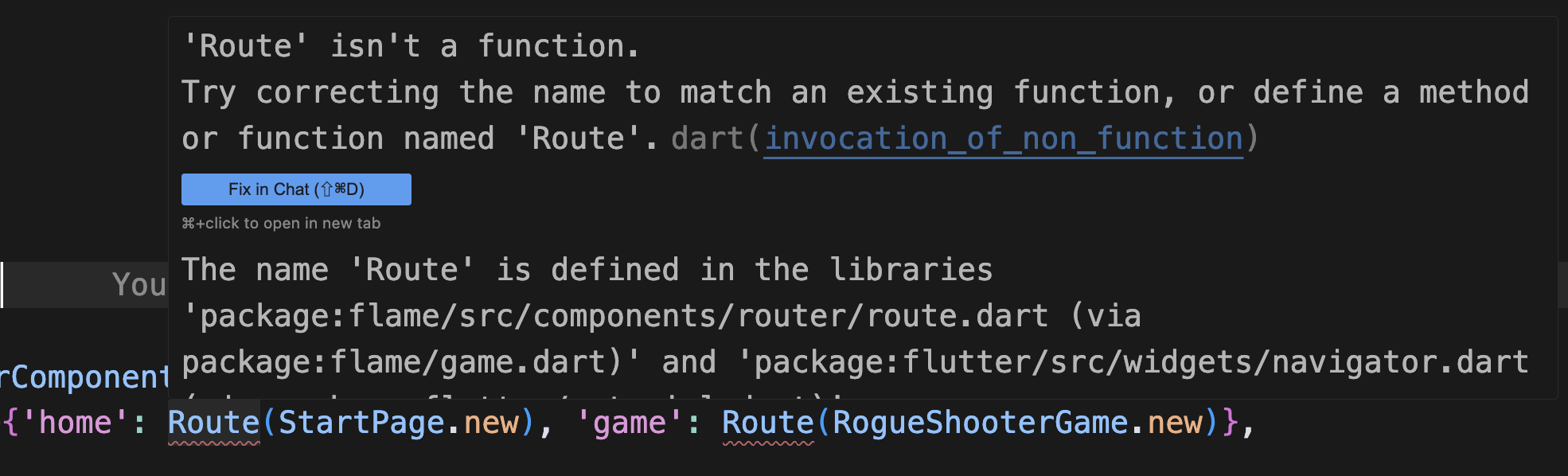 The name 'Route' is defined in the libraries 'package:flame/src/components/router/route.dart (via package:flame/game.dart)' and 'package:flutter/src/widgets/navigator.dart (via package:flutter/material.dart)'.
