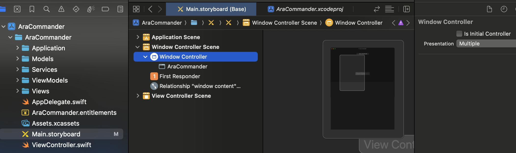 Main.storyboard를 열어서 Window Controller를 누른다음 오른쪽에 있는 Attributes Inspector에서 Is Initial Controller를 체크 해제하면 된다.
