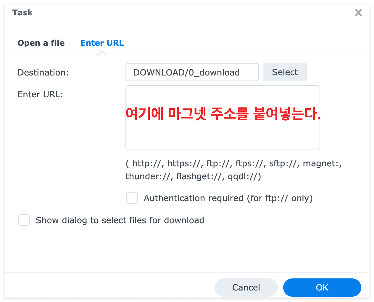 아래는 NAS로 많이 쓰는 시놀로지 나스의 Download Station에서 파일을 다운받고 할때 마그넷 주소를 넣는 화면이다.