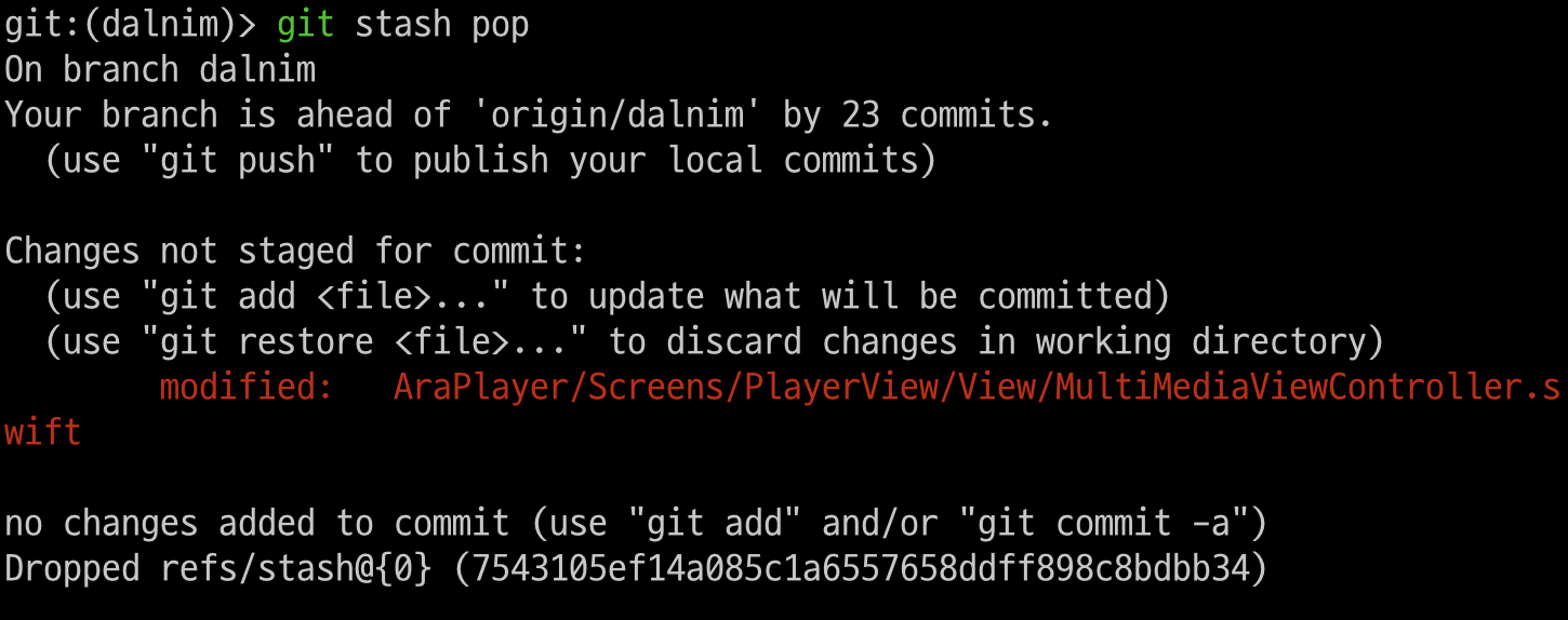 git stash pop 을 사용후 git stash list를 했을때. 맨첫번째것이 리스트에서 사라진것을 볼수 있다.