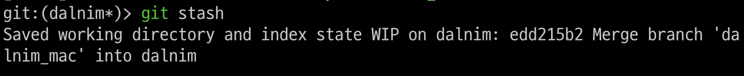 > git stash 명령어를 치면 현재 작업중인게 저장되었다고 나온다. "git stash push"와 동일한 명령어다.