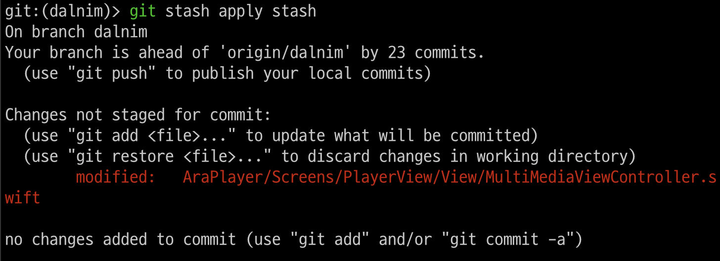 git stash apply stash 를 사용후 git stash list를 했을때. 맨첫번째것이 리스트에서 남아있는것을 볼수 있다.