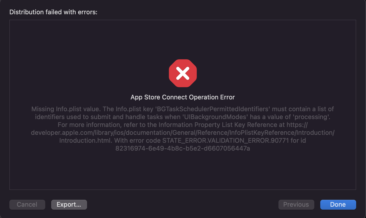 Missing Info.plist value. The Info.plist key 'BGTaskSchedulerPermittedIdentifiers' must contain a list of identifiers used to submit and handle tasks when 'UIBackgroundModes' has a value of 'processing'. For more information, refer to the Information Property List Key Reference at https://developer.apple.com/library/ios/documentation/General/Reference/InfoPlistKeyReference/Introduction/Introduction.html. With error code STATE_ERROR.VALIDATION_ERROR.90771 for id 82316974-6e49-4b8c-b5e2-d6607056447a