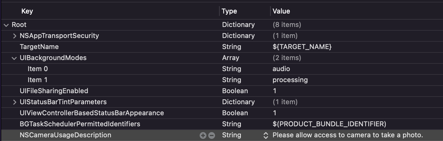 가끔 NSCameraUsageDescription키를 넣으면 Privacy - Camera Usage Description처럼 바뀌는 경우가 있는데, 둘은 똑같은 거다. (근데 언제 이렇게 바뀌는지는 모르겠다.)