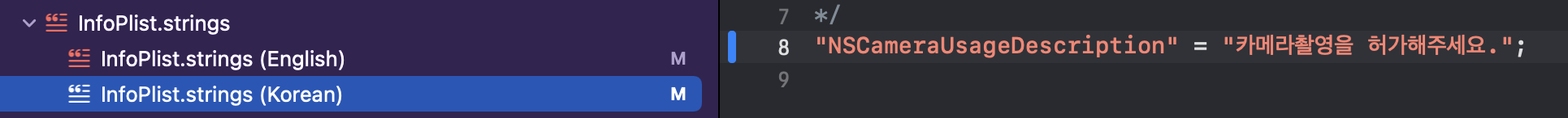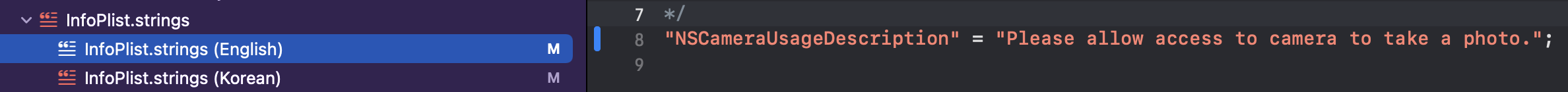 다국어화를 할려면 InfoPlist.string에 NSCameraUsageDescription키를 넣고 value(설명글)을 추가하면 된다.